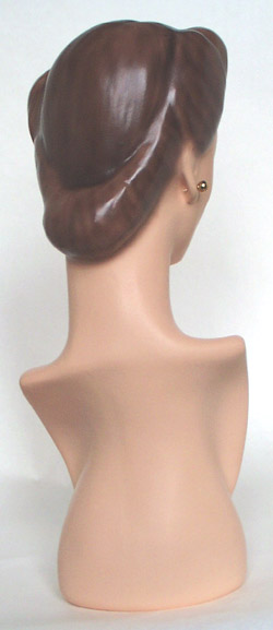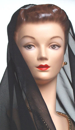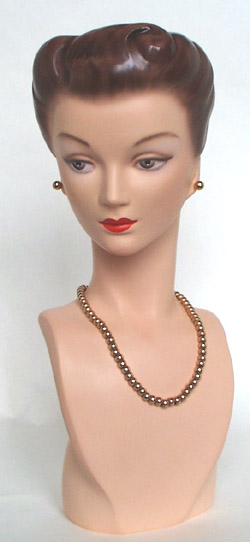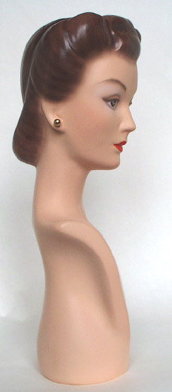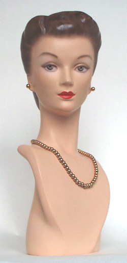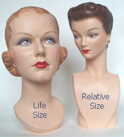 This is a precise REPLICA of a 1940's department store display bust that was molded directly from a vintage model. The original of this model was used for jewelry display and made of a rubber called Vulcanite. She is smaller than life-size and could NOT be used for hats (the relative size is shown in the last photo). The early jewelry display models were often smaller to make the displayed jewelry appear more noticeable and even somewhat overwhelming. This model would make the jewelry look super in a storefront window from the period where this street advertising was so important and window space was limited. The store operators were attempting to "trick" us into buying even in this earlier era. The ears have lobes open in the back that allow hook earrings to be used. The height is approximately 14" and the width is 5 1/2" at her chest. Apparel shown is for display only and is not included in the sale. This model was cast in US Gypsum #1 casting plaster (much stronger and more chip-resistant than normal plaster). I prefer plaster because it is historically correct, is timeless, and stable for many generations to come. Our models closely resemble the originals in weight and feel and carry the original and charming mold marks that are characteristic of handcrafted work. These marks should not be considered defects and only add character to the artwork. Our models are made to look, feel, smell and taste very similar to what the vintage model would when new (no better, no worse). These replicas are in no way ever meant to deceive and the undersides of the bases are hand-scribed with the year, our signature, and are numbered in the order that they are made. Our international friends are welcome to bid and we will ship anywhere in the world but must add the actual shipping charge to the selling price. S/H/I on this model with the base is $15.00 with Priority Mail in the contiguous 48 states. Payment may be made by credit card with PayPal (our favorite), postal or bank money order, or personal check (and with good feedback will not delay shipping). We will answer all email messages ASAP and invite inquiries BEFORE bidding. Your interest is sincerely appreciated and happy bidding. |
